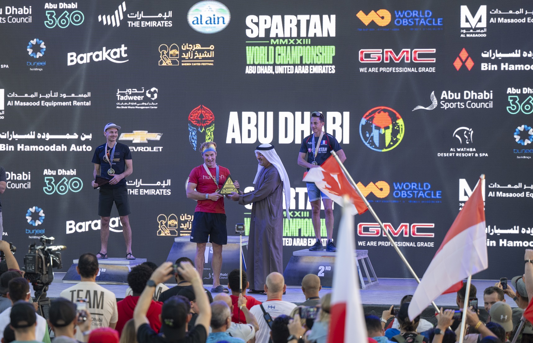 توج الفائزين عارف حمد العواني الأمين العام لمجلس أبوظبي الرياضي، وجو دي سينا مؤسس سبارتن والرئيس التنفيذي، وسهيل العريفي المدير التنفيذي لقطاع الفعاليات في مجلس أبوظبي الرياضي.