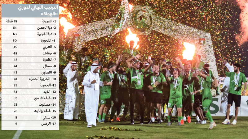تسلم فريق العروبة، أمس، درع دوري الدرجة الأولى للموسم الرياضي 2023-2024، وتقلد لاعبوه الميداليات الذهبية، بعد التعادل مع مضيفه العربي (2-2)، رافعاً رصيده إلى 78 نقطة، وهو الأعلى لفريق في المواسم الماضية للمسابقة، كما حقق 30 نتيجة إيجابية في رقمين جديدين بالبطولة التي أسدل الستار على أحداثها.