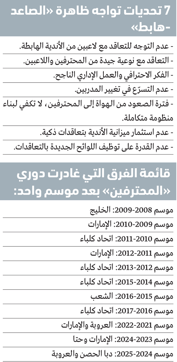 وأضاف: «العمل الإداري الناجح والقدرة على توظيف اللوائح الجديدة، من حيث التعاقدات مع كم أكبر من الأجانب والمقيمين، يسهلان مهام الأجهزة الفنية، ويسمحان بوضع تلك التعاقدات في خدمة الفريق، وبالتالي تجنب ظاهرة (الصاعد-هابط)، بعد موسم واحد في المحترفين، وهناك أندية عدة سبق لها التعرّض للهبوط إلى دوري الهواة، وعادت إلى المحترفين مع تعاقدات ذكية رغم ميزانياتها المحدودة، ونجحت في البقاء في دوري الأضواء، ومنها على سبيل المثال، عجمان، وبني ياس، وخورفكان، وغيرها».