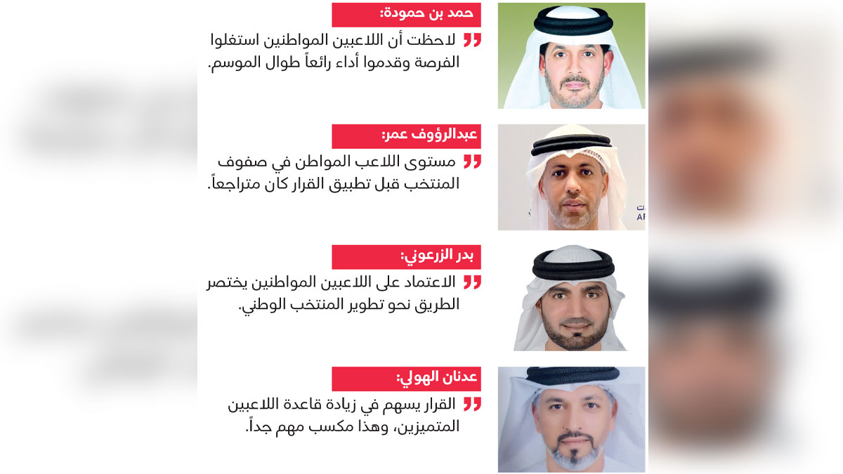 من جهته أكد مدرب المنتخب الوطني بدر الزرعوني، أن الاعتماد على اللاعبين المواطنين في المنافسات يختصر الطريق نحو تطوير المنتخب الوطني، إذ إن القرار قدّم للاعب المواطن فرصة لخوض مباريات أكثر وإظهار قدراته، ورفع مستواه الفني والبدني وتحسين مهاراته التهديفية، مبيناً أن منتخب الإمارات فاز على ضيفه الكويتي في أول مباراة ودية أقيمت بعد تطبيق القرار، كما أن الاستمرار في تنفيذ القرار سيمهد الطريق لاكتشاف مواهب جيدة في المستقبل.
