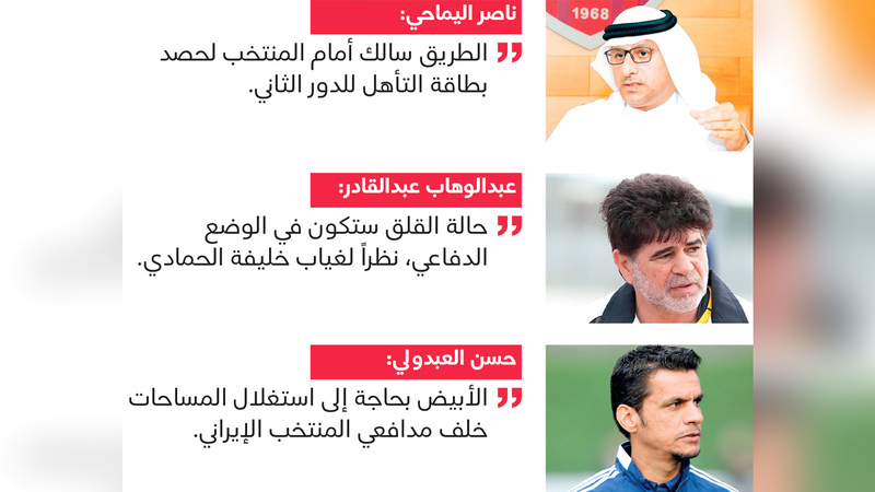 بدوره أكد مدرب فرق الظفرة وعجمان وبني ياس السابق، العراقي عبدالوهاب عبدالقادر، أن المنتخب رغم أنه يضم مجموعة من اللاعبين المميزين، إلا أنه لم يظهر حتى الآن بإمكاناته الحقيقية، مشدداً على أن اللاعبين مطالبون بالكثير خصوصاً في مباراة الغد المرتقبة أمام منتخب إيران. وأضاف: «بالنسبة للخط الأمامي بعد إصابة سلطان عادل الذي بذل مجهوداً كبيراً في المباراتين السابقتين، فإن هناك خيارات كثيرة أمام المدرب بينتو في ظل وجود المهاجم علي مبخوت الذي يُعد الخيار الأنسب، إلى جانب أيضاً وجود كل من كايو كايندو وعلي صالح، فضلاً عن وجود يحيى الغساني وحارب عبدالله». واعتبر عبدالوهاب عبدالقادر أن حالة القلق في المنتخب ستكون في الوضع الدفاعي نظراً لغياب المدافع خليفة الحمادي، لافتاً في الوقت نفسه إلى وجود خالد الهاشمي وكذلك بدر ناصر، إضافة إلى أحمد جميل وزايد سلطان في الخط الخلفي. وشدّد عبدالوهاب عبدالقادر على أن مباراة المنتخب الوطني وإيران بحاجة إلى لاعبين أصحاب خبرة أكثر في التعامل مع مثل هذه المباريات.