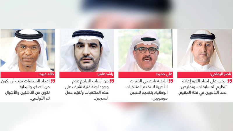 وقالوا لـ«الإمارات اليوم»: «إخفاق المنتخب الأولمبي خلال مشاركته الأخيرة في نهائيات كأس آسيا تحت 23 عاماً، وتعرضه لثلاث هزائم متتالية أمام كل من كوريا الجنوبية واليابان والصين، وقبله التراجع الكبير في نتائج منتخبي الشباب والناشئين، يجب أن يكون نقطة انطلاقة جديدة لهذه المنتخبات، من خلال قيام اتحاد الكرة بدراسة متأنية، ومعرفة الأسباب كافة التي أدت إلى هذه الإخفاقات، والعمل على إيجاد الحلول اللازمة لها من الجوانب كافة، حتى لا تتكرر في كل مرة».