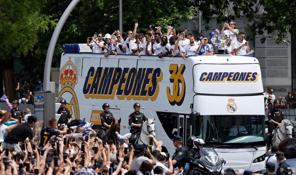 واحتشد الآلاف من المشجعين لاستقبال حافلة الفريق التي طافت أرجاء العاصمة قبل توجهها إلى إلى مكان الاحتفال التقليدي للنادي في ميدان سيبيليس. وجرى تسليم كأس البطولة خلال مراسم احتفالية في المركز التدريبي للنادي. واعتاد ريال مدريد على الاحتفال بالألقاب في ملعب سانتياجو برنابيو لكن الاستاد يستعد لاستضافة حفل موسيقي اليوم. وقال فلورنتينو بيريز رئيس ريال مدريد “الفريق تخطى وضعا بدا وأنه لا يمكن تجاوزه”،في إشارة إلى موجة من الإصابات التي ضربت اللاعبين في وقت مبكر من الموسم.