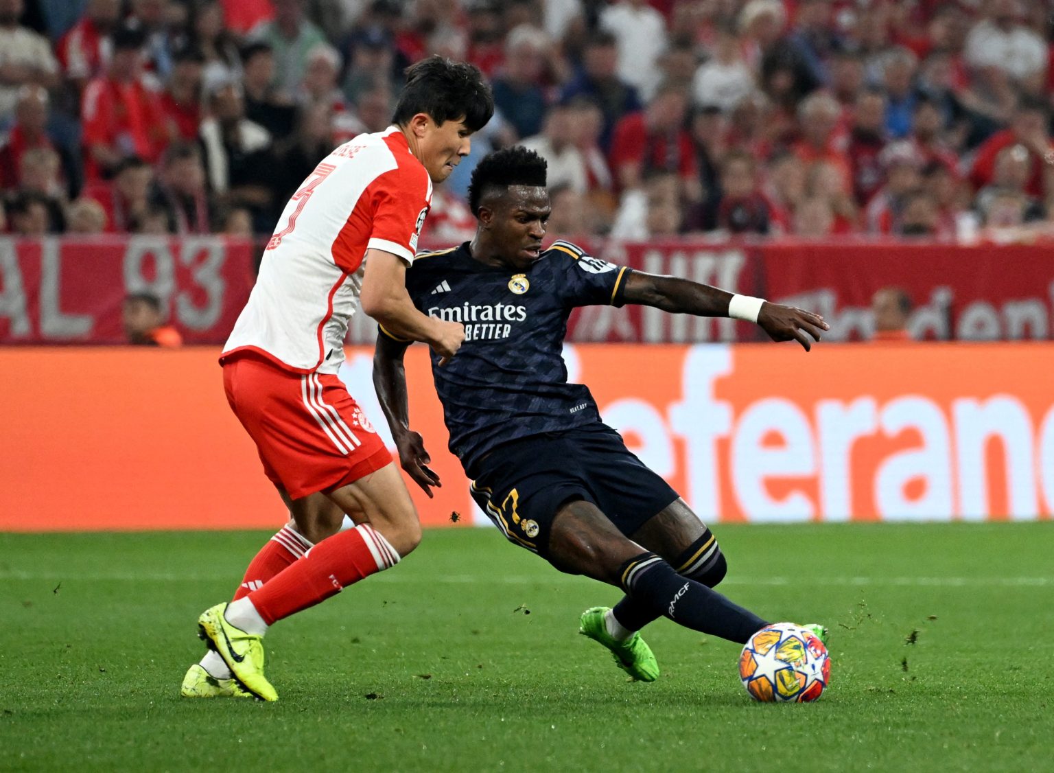 ومنح البرازيلي فينيسيوس جونيور التقدم للنادي الملكي (24)، ليرد بايرن بهدفين في غضون أربع دقائق مطلع الشوط الثاني عبر لوروا سانيه (53) والمهاجم الإنجليزي هاري كاين (57 من ركلة جزاء)، وعاد فينيسيوس الى الواجهة بادراكه التعادل من ركلة جزاء في الدقيقة 83.