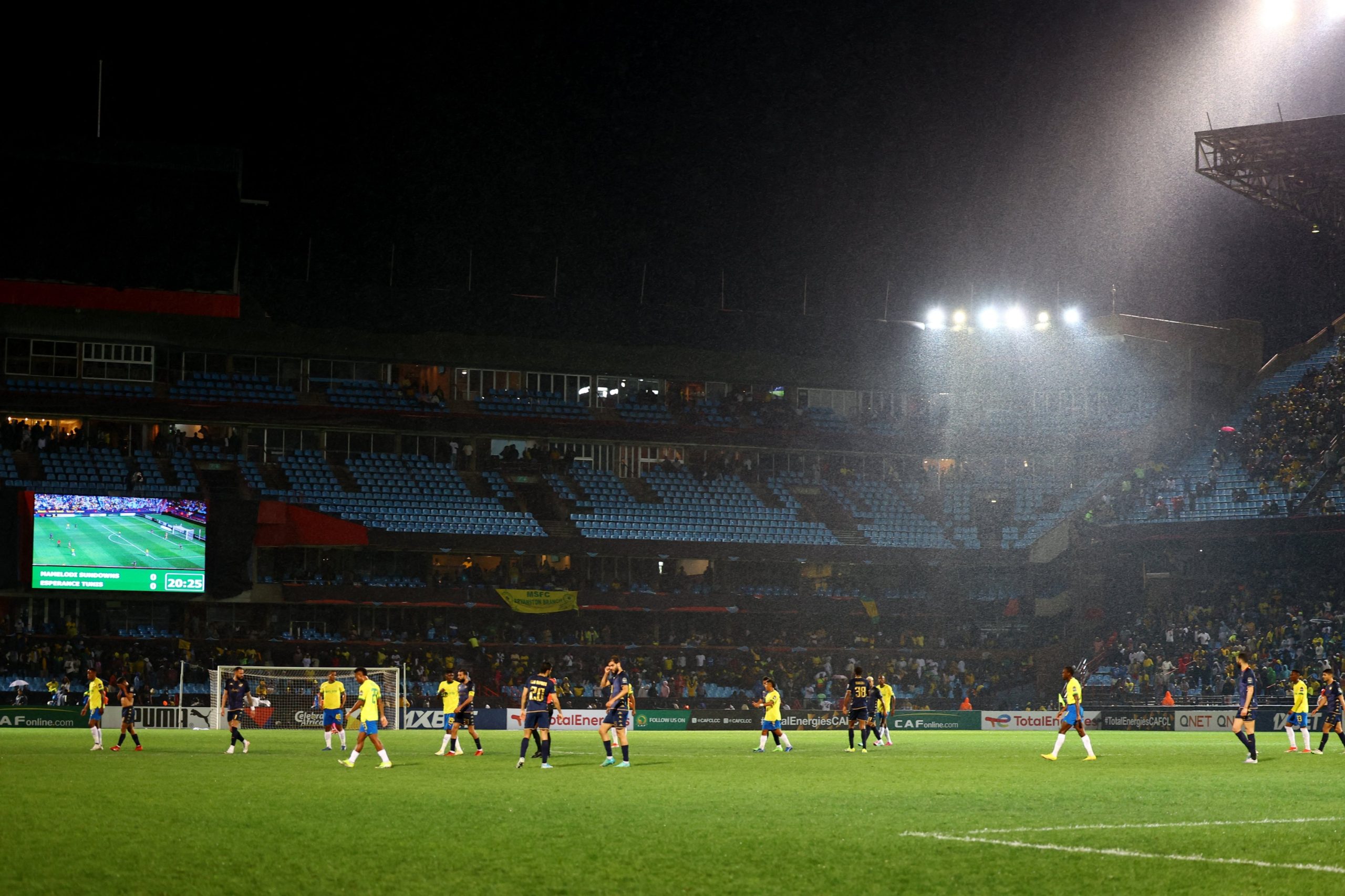 أوقفت عاصفة رعدية مفاجئة مباراة فريقي صن داونز الجنوب إفريقي والترجي التونسي في إياب نصف نهائي دوري أبطال إفريقيا هذا الموسم 2023-2024.