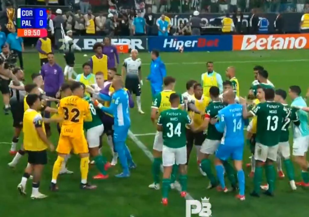 وركض مدافعان نحو لاعب مانشستر يونايتد وبرشلونة السابق الذي سقط أرضا قرب خط التماس حيث كان بدلاء كورينثيانز يُجرون عملية الإحماء مما أدى إلى شجار بين الفريقين. وتوقفت المباراة لعدة دقائق.