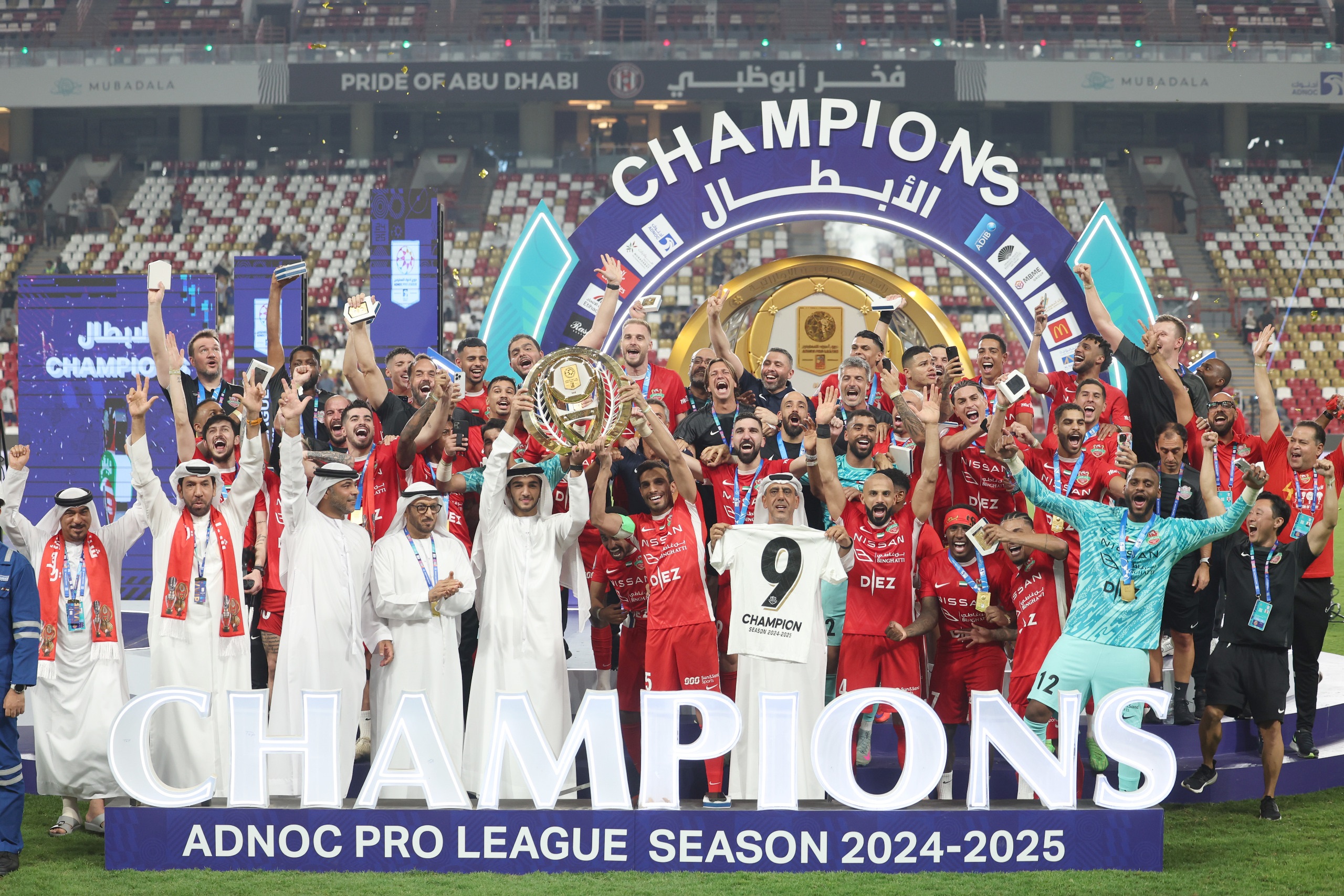 توّج سموّ الشيخ محمد بن راشد بن محمد بن راشد آل مكتوم، رئيس مجلس إدارة نادي شباب الأهلي، «فرسان دبي» بطلاً لدرع دوري أدنوك للمحترفين للمرة التاسعة في تاريخه، عقب فوزه على الجزيرة 2-1 في الجولة الأخيرة من البطولة التي أقيمت الأحد، على استاد محمد بن زايد، بحضور الشيخ حمدان بن مبارك، رئيس اتحاد كرة القدم، ووزير الصناعة والتكنولوجيا المتقدمة، سلطان أحمد الجابر، ورئيس رابطة المحترفين، عبدالله الجنيبي.