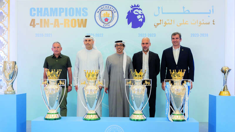 وسلم خلدون المبارك وبيب غوارديولا، سموّ الشيخ منصور بن زايد آل نهيان، الجوائز التي حصدها النادي بمشاركة مجموعة من الأطفال المتدربين في «مدارس السيتي لكرة القدم» ضمن نحو 3000 متدرب في هذه المدارس. ويُعدُّ لقب الدوري الإنجليزي الممتاز الثالث للسيتي خلال موسم 2024/2023 بعد فوزه بكأس السوبر الأوروبي في شهر يوليو 2023 وكأس العالم للأندية في ديسمبر 2023.