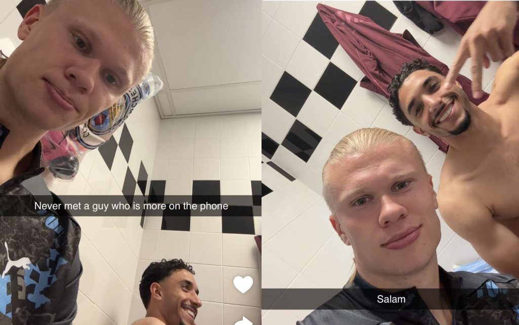 ويكثر بين اللاعبين المزاح داخل وخارج الملعب، وظهر ذلك جلياً في منشورات هالاند على مواقع التواصل الاجتماعي، إذ نشر المهاجم العملاق على حسابه في “سناب شات” صوة تجمعه مع عمر مرموش داخل غرفة ملابس السيتي وكتب فيها: “لم أقابل قط شخصا يتحدث عبر الهاتف أكثر منه”.