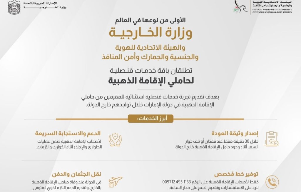 بهدف ترسيخ مكانة الإمارات كبيئة جاذبة للمواهب والمستثمرين، أطلقت وزارة الخارجية والهيئة الاتحادية للهوية والجنسية والجمارك وأمن المنافذ، خلال فعاليات معرض جيتكس جلوبال 2025، باقة من الخدمات القنصلية غير المسبوقة المخصصة لحاملي الإقامة الذهبية. وتمثل هذه المبادرة نقلة نوعية تعزز التكامل بين الجهات الحكومية وتدعم أهداف مبادرة “عام المجتمع 2025”. الخدمات القنصلية الجديدة تشمل الخدمات …