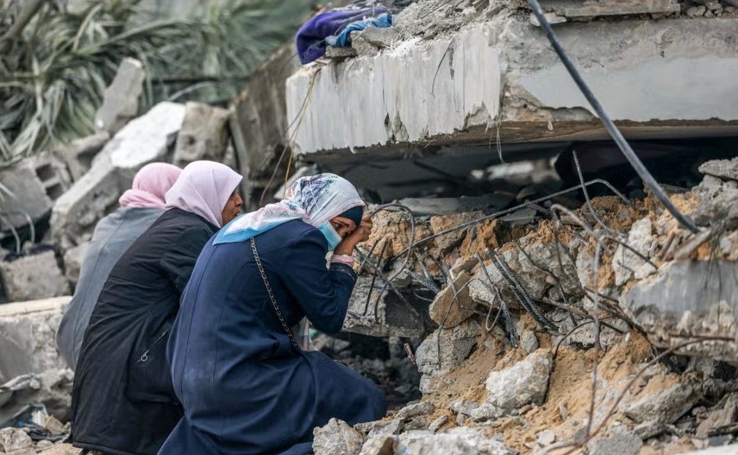 واحتشد الناس حول أنقاض منزل أسرة أبو عدوان حيث كانت تحتمي أسرة مريم بعدما فرت من منزلها في منطقة أكثر عرضة للخطر بالقرب من حدود غزة مع إسرائيل.