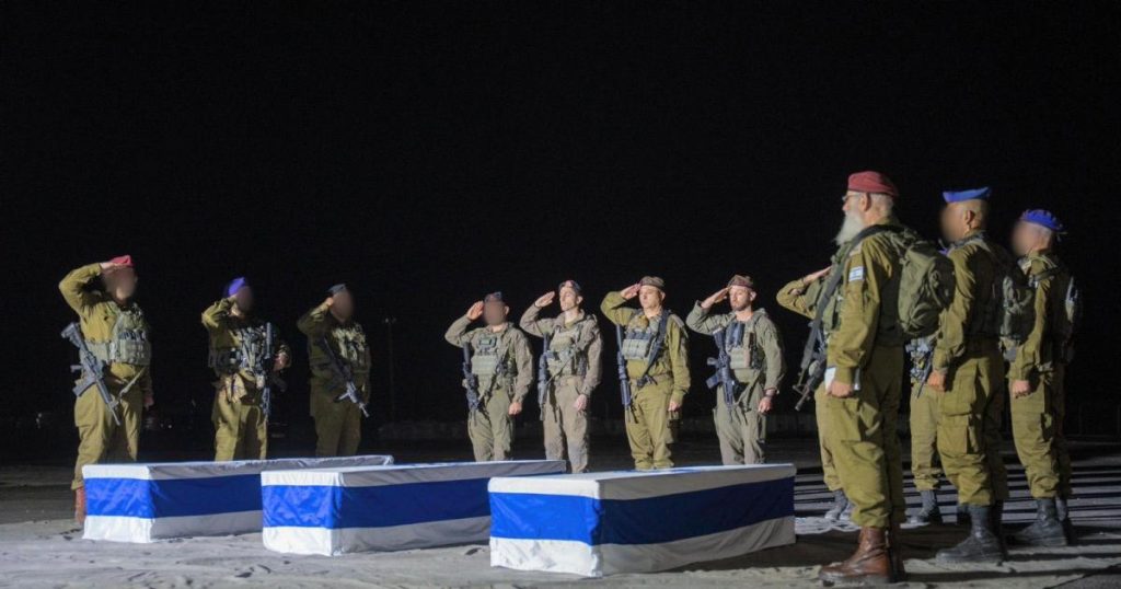 وقال الجيش في بيان صحفي له، “بعد استكمال عملية التشخيص من قبل المعهد الوطني للطب الشرعي بالتعاون مع شرطة إسرائيل والحاخامية العسكرية، أبلغ مندوبو الجيش عائلات المختطفين العقيد أساف حمامي، النقيب عومر ماكسيم ناؤترا، والرقيب أول عوز دانيئيل، بأن جثامين أبنائهم اعيدت إلى إسرائيل لمواراة الثرى”.