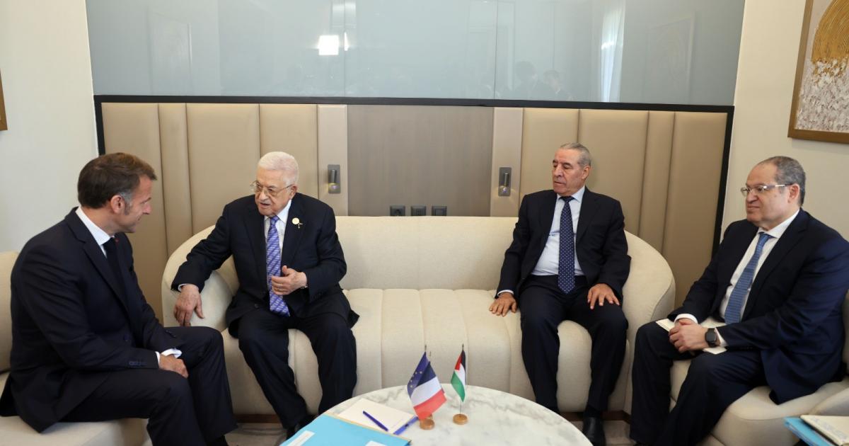 وشكر الرئيس، نظيره الفرنسي، على اعتراف بلاده بدولة فلسطين، وترؤسها إلى جانب السعودية المؤتمر الدولي رفيع المستوى لتسوية القضية الفلسطينية، وتنفيذ حلّ الدولتين.