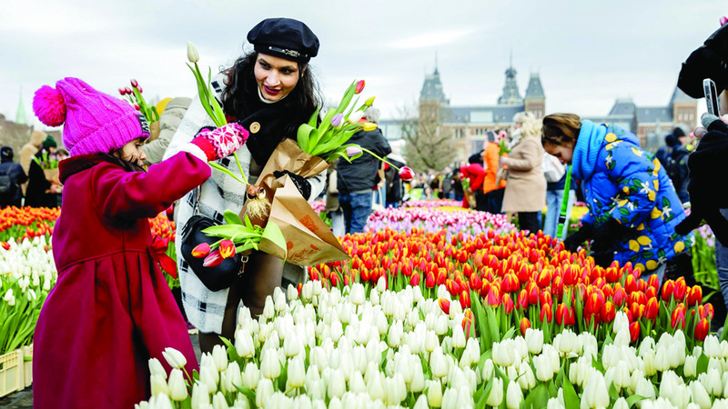 مجموعة من الناس يقطفون أزهار التوليب الشهيرة في اليوم الوطني لزهرة التوليب في أمستردام العاصمة الهولندية. وستظل حديقة قطف أزهار التوليب مفتوحة للزوار في حي ميوزمبلين، أحد أرقى أحياء العاصمة، حيث يستطيع الزوار قطف باقة من أزهار التوليب مجاناً دون مقابل، وهو يوم مهم بالنسبة لسكان العاصمة وينتظره الجميع نتيجة حبهم لهذه الزهرة الجميلة والمحببة للجميع.