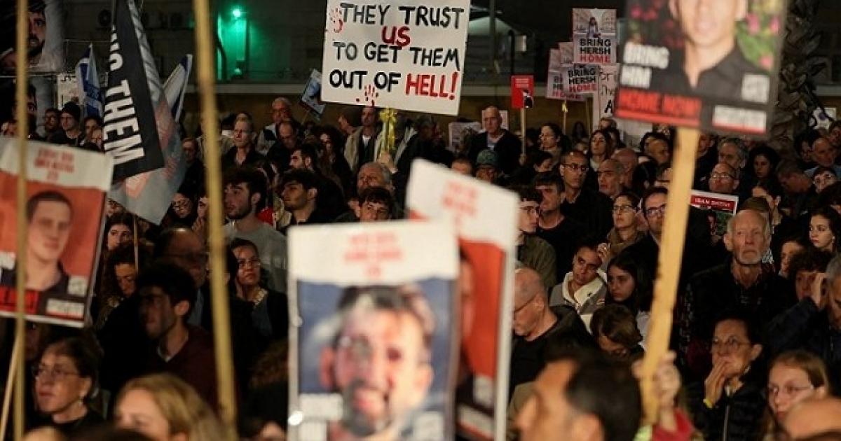 تظاهر عشرات الآلاف من الإسرائيليين، مساء اليوم السبت 20 يناير 2024، في عدة مواقع بما في ذلك أمام منزل رئيس الحكومة، بنيامين نتنياهو ، في قيسارية، لمطالبته بالعمل على التوصل إلى اتفاق يسمح بـ”إعادة الرهائن” الإسرائيليين لدى فصائل المقاومة الفلسطينية في قطاع غزة المحاصر.