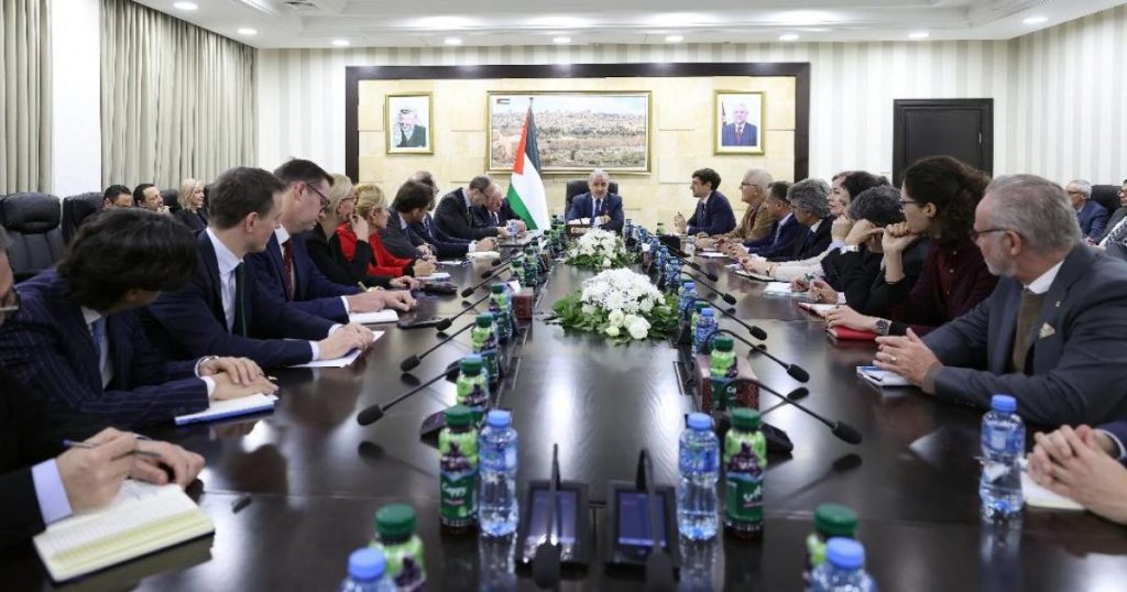 التقى رئيس الوزراء الفلسطيني محمد اشتية ، اليوم الثلاثاء 30 يناير 2024 ، في مكتبه ب رام الله ، سفراء وممثلي وقناصل الدول الأوروبية المعتمدين لدى دولة فلسطين، بحضور وزير الخارجية والمغتربين رياض المالكي ، حيث وضعهم في صورة عدوان الاحتلال على شعبنا في قطاع غزة والضفة الغربية بما فيها القدس ، بالإضافة إلى المرحلة الجديدة من تنفيذ برنامج الإصلاح الحكومي في المنظومة القضائية والأمنية والإدارية والمالية.