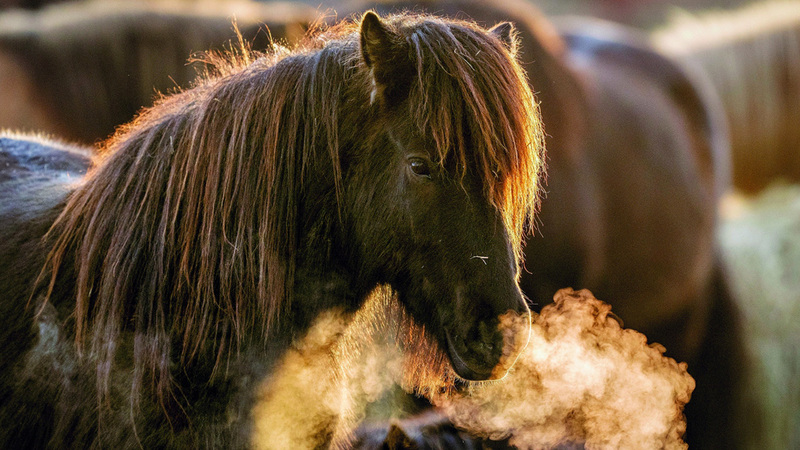 حصان آيسلندا يتنفس في جو بارد بمزرعة خيول في فرانكفورت بألمانيا.
