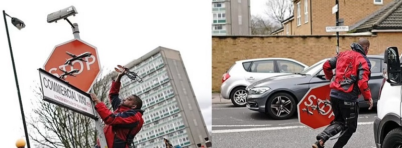 وبعد برهة، فكّ رجل العلامة المرورية عن عمودها وأخذها هارباً، كما ظهر في مقاطع فيديو صوّرها شهود وعرضتها وسائل الإعلام البريطانية.