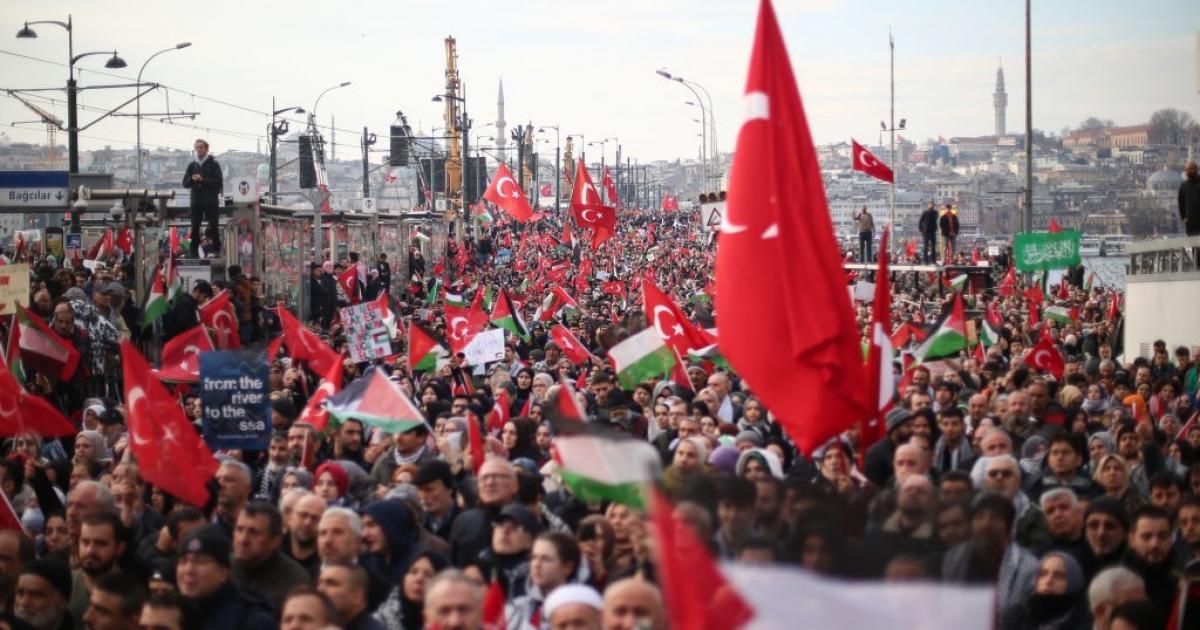 شارك عشرات الآلاف في مسيرة بمدينة إسطنبول اليوم الإثنين الأول من يناير 2024 ، دعما لقطاع غزة وتنديدا بالحرب الإسرائيلية المتواصلة منذ 87 يوما.