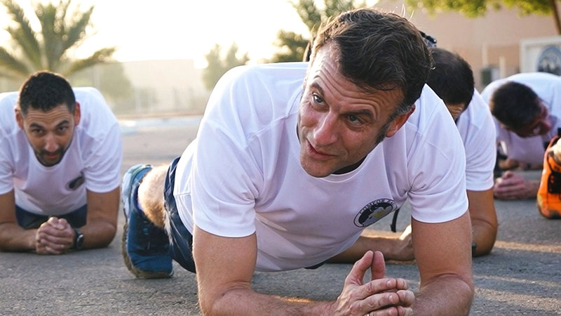 نشر قصر الإليزيه مقطع فيديو أثار ضجة واسعة على منصات التواصل الاجتماعي، يظهر فيه ماكرون وهو يؤدي تمارين رياضية متنوعة إلى جانب جنود فرنسيين، تحت إشراف المدرب الرياضي الشهير تيبو إنشيب. الفيديو، الذي انتشر بسرعة على “تيك توك” و”إنستغرام” و”إكس”، يهدف إلى ربط صورة الرئيس بالانضباط العسكري والصلابة الجسدية، في محاولة لإظهار قيادته القوية وقدرته على التحمل.