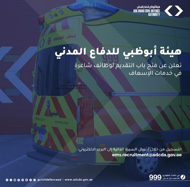 أعلنت هيئة أبوظبي للدفاع المدني عن فتح باب التقديم لوظائف شاغرة في خدمات الإسعاف الوطني، على أن يتم التسجيل من خلال إرسال السيرة الذاتية إلى البريد الإلكتروني http://[email protected]، مشيرة إلى أن الشواغر الوظيفية المتاحة تتضمن 6 مجالات هي مسعف، مشرف طبي، أخصائي مكافحة العدوى، أخصائي الجودة الطبية – الصحية، صيدلي، طيبي أخصائي طب طوارئ.