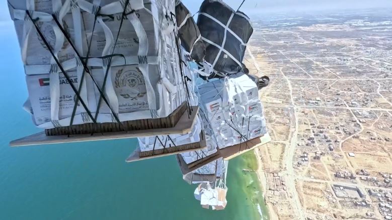 فقد نفذت الإمارات اليوم عملية الإنزال الجوي الـ71 للمساعدات في القطاع ضمن عملية “طيور الخير”، التابعة لعملية “الفارس الشهم 3″، بالتعاون مع المملكة الأردنية الهاشمية الشقيقة، وبمشاركة كل من ألمانيا، إيطاليا، بلجيكا، وفرنسا.