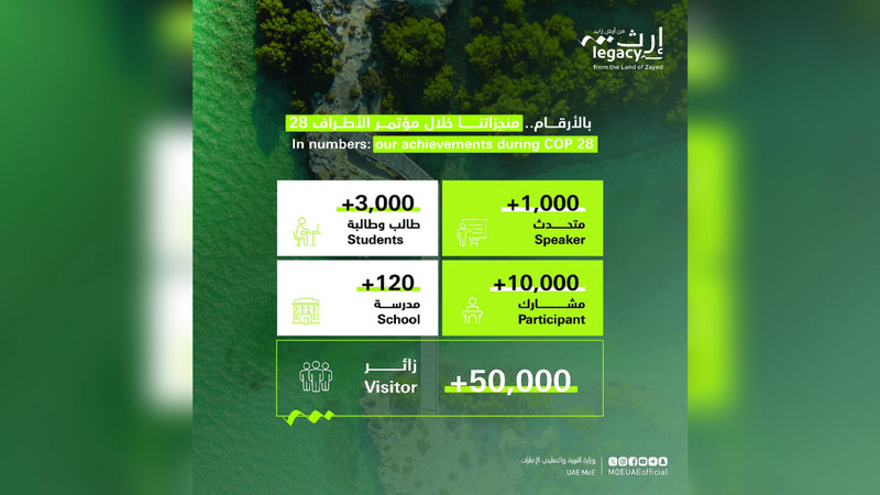 وإيماناً منها بأهمية الشراكات في إحداث تغيير مستدام في القطاع التعليمي، أعلنت وزارة التربية والتعليم خلال مؤتمر «COP28» عن اتفاقيتي تعاون، الأولى مع الصندوق الدولي للحفاظ على الحبارى، بهدف تصميم وتنفيذ مبادرات تهدف إلى توعية الشباب والطلبة بأهمية حماية البيئة، وتعزيز دورهم في تحمّل المسؤولية، في خطوة تهدف إلى المحافظة على الأنواع البرية وموائلها الطبيعية، وزيادة الفهم وتغيير السلوك بشكل مستدام، والثانية مع وزارة التغير المناخي والبيئة، وشركة بيانات، بهدف تعزيز العمل المشترك في مجال دعم وتعزيز الحراك العلمي والبحثي المستدام، وإطلاق منحة البرامج البحثية التعاونية لعام 2024. ووصل عدد زوار «مركز التعليم الأخضر.. إرث من أرض زايد» خلال مؤتمر «COP28» إلى أكثر من 50000 زائر، متجاوزاً توقعات عدد الزوار بنسبة أكثر من 270%. وكان لافتاً التفاعل الطلابي والأكاديمي مع فعاليات المركز، حيث استقبل المركز خلال أيامه الـ13، زيارات من أكثر من 3500 طالب وطالبة من 122 مدرسة من كل أنحاء الدولة. واستضاف المركز 250 جلسة نقاشية وورشة عمل شارك فيها أكثر من 1000 متحدث من أكثر من 50 دولة، وحضرها أكثر من 10 آلاف ضيف.