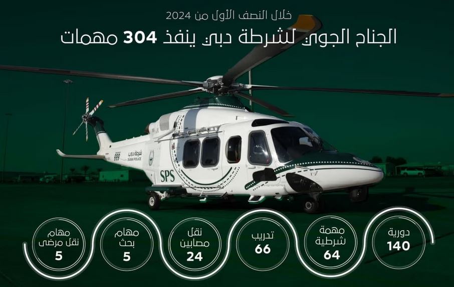 كشفت إحصائيات مركز الجناح الجوي لشرطة دبي، عن تنفيذه 304 مهمات خلال النصف الأول من العام الجاري، بينها مهام نقل مصابين ومرضى ومهام بحث، وتدريب، إلى جانب تنفيذ مهام شرطية وأمنية متعددة لتعزيز الأمن والأمان في إمارة دبي.