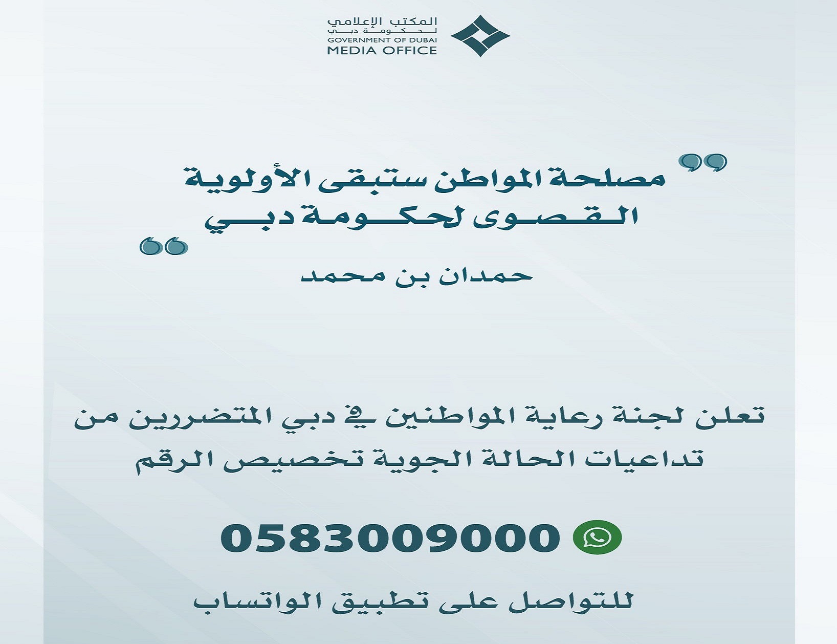 تخصيص رقم على تطبيق “واتساب” لاستقبال طلبات الدعم من المواطنين المتضررين في دبي من الأحوال الجوية الأخيرة