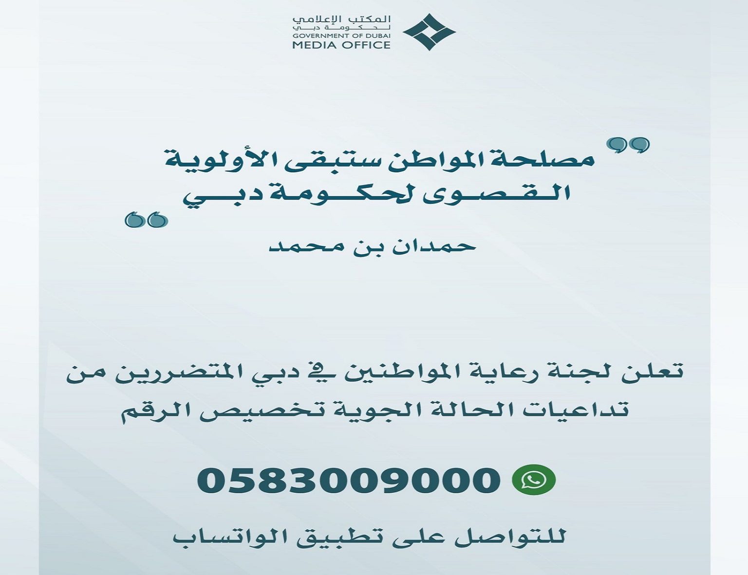 وقال سعادته إنه ضمن توجيهات سمو ولي عهد دبي وبمتابعة سمو الشيخ منصور بن محمد بن راشد آل مكتوم، رئيس اللجنة العليا لإدارة الطوارئ والكوارث بدبي، بإنشاء لجنة لدراسة جميع طلبات المتضررين من المواطنين وتحديد كيفية معالجتها، مع إعطاء أولوية لصيانه جميع منازلهم المتضررة وإعادة تأهيلها، فقد تم تخصيص الرقم (0583009000) على تطبيق “واتساب” لاستقبال طلبات الدعم من المواطنين المتضررين.