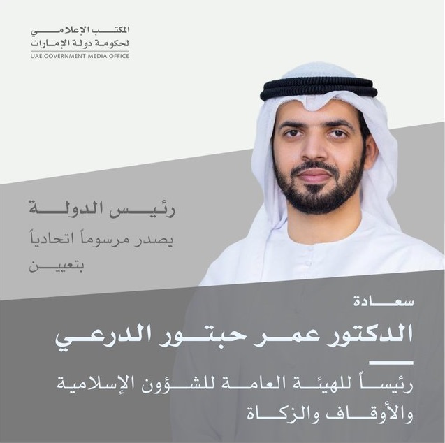 شاركها فيسبوك تويتر لينكدإن بينتيريست تيلقرام البريد الإلكتروني أصدر صاحب السمو الشيخ محمد بن زايد آل نهيان، رئيس الدولة، حفظه الله، مرسوماً اتحادياً بتعيين سعادة الدكتور عمر حبتور الدرعي رئيساً للهيئة العامة للشؤون الإسلامية والأوقاف والزكاة.