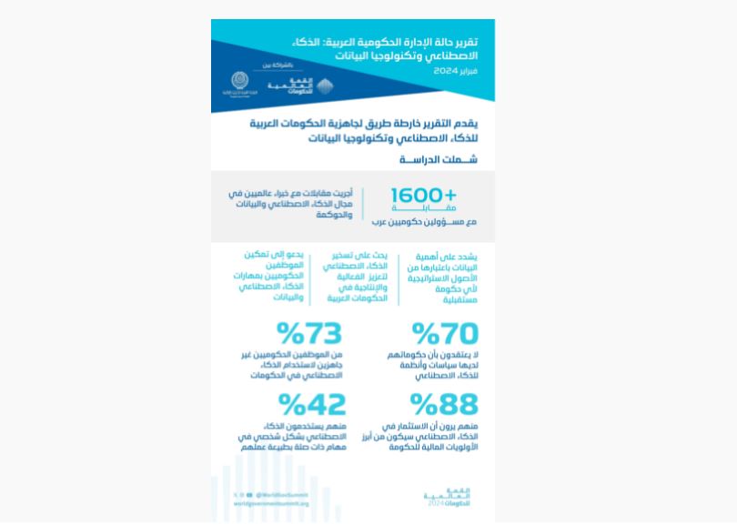 شهد منتدى الإدارة الحكومية العربية ضمن أعمال القمة العالمية للحكومات 2024، إطلاق تقرير حالة الإدارة الحكومية العربية في نسخته الثالثة بعنوان: “حالة الإدارة الحكومية العربية: الذكاء الاصطناعي وتكنولوجيا البيانات”، التي ركز فيها على الذكاء الاصطناعي والبيانات وجاهزية الإدارة الحكومية العربية لهما.