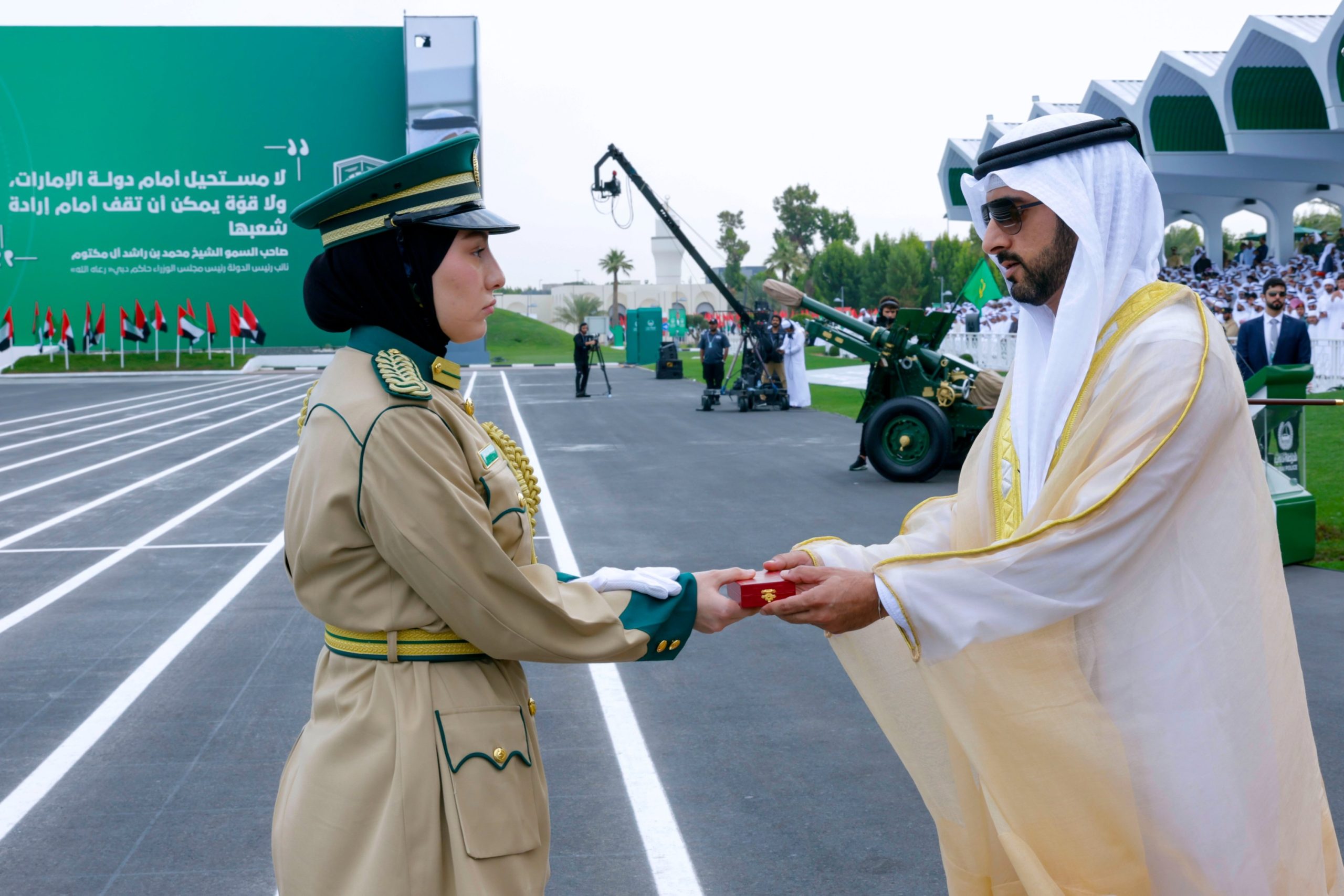 بعد ذلك كرّم سموه إلى جانبه معالي الفريق عبد الله خليفة المري، المتفوقين، وقلّدهم سموه أوسمة التفوق، وهنأهم على إبداعهم كل في مجاله وتمنى لهم مزيداً من النجاح في مسيرتهم العملية. وجرت مراسم تسليم وتسلُّم العَلَم من الدفعة 31 الى الدفعة 32 مصحوباً بأدائهم القسم بأن يحافظوا على العلم مرفوعاً عالياً.