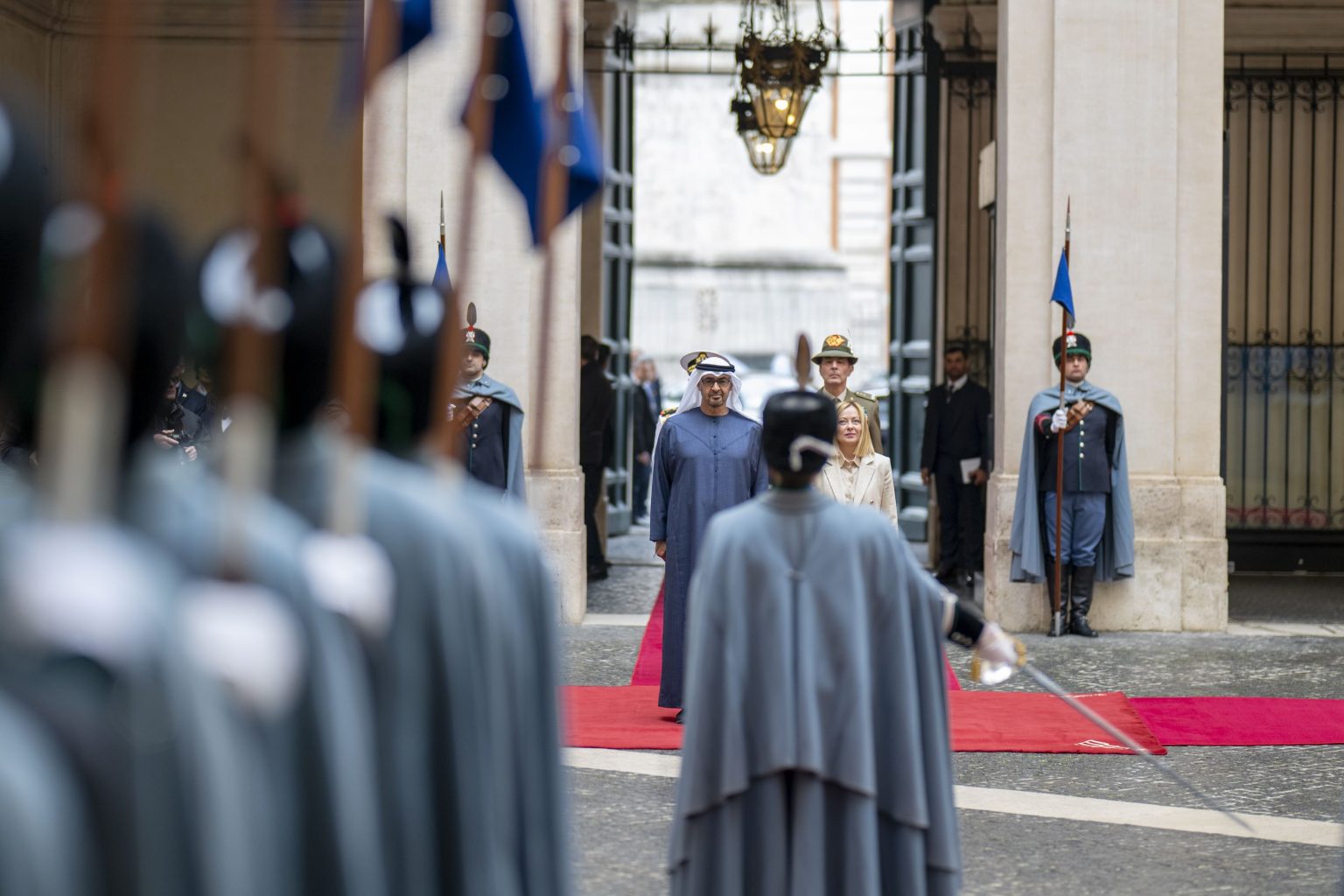 جاء ذلك خلال لقاء صاحب السمو رئيس الدولة ورئيسة الوزراء الإيطالية، في مقر رئاسة الحكومة في روما، في إطار “زيارة دولة” يقوم بها سموه إلى إيطاليا حيث رحبت معاليها بسموه والوفد المرافق، معربة عن تطلعها إلى أن تشكل الزيارة دفعاً قوياً لمسار علاقات التعاون الثنائي والعمل المشترك.