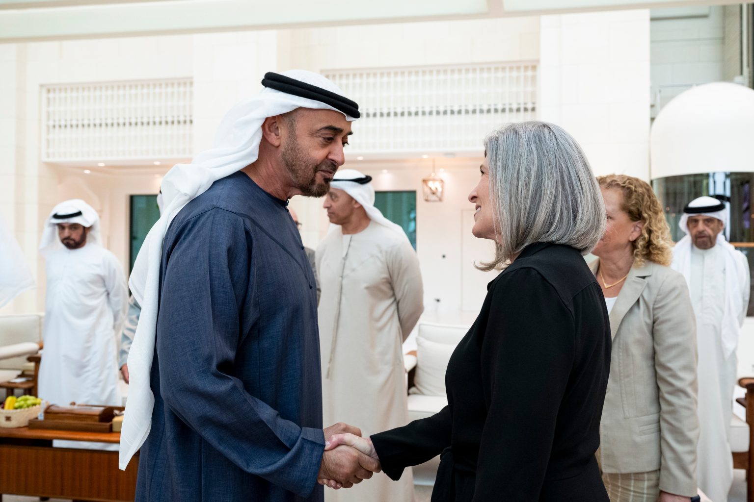 حضر اللقاء .. سمو الشيخ حمدان بن زايد آل نهيان ممثل الحاكم في منطقة الظفرة وسمو الشيخ ذياب بن زايد آل نهيان وسمو الشيخ حمدان بن محمد بن زايد آل نهيان نائب رئيس ديوان الرئاسة للشؤون الخاصة ومعالي الشيخ محمد بن حمد بن طحنون آل نهيان مستشار رئيس الدولة ومعالي الدكتور سلطان بن أحمد الجابر وزير الصناعة والتكنولوجيا المتقدمة ومعالي يوسف العتيبة سفير الدولة لدى الولايات المتحدة الأميركية وعدد من المسؤولين.