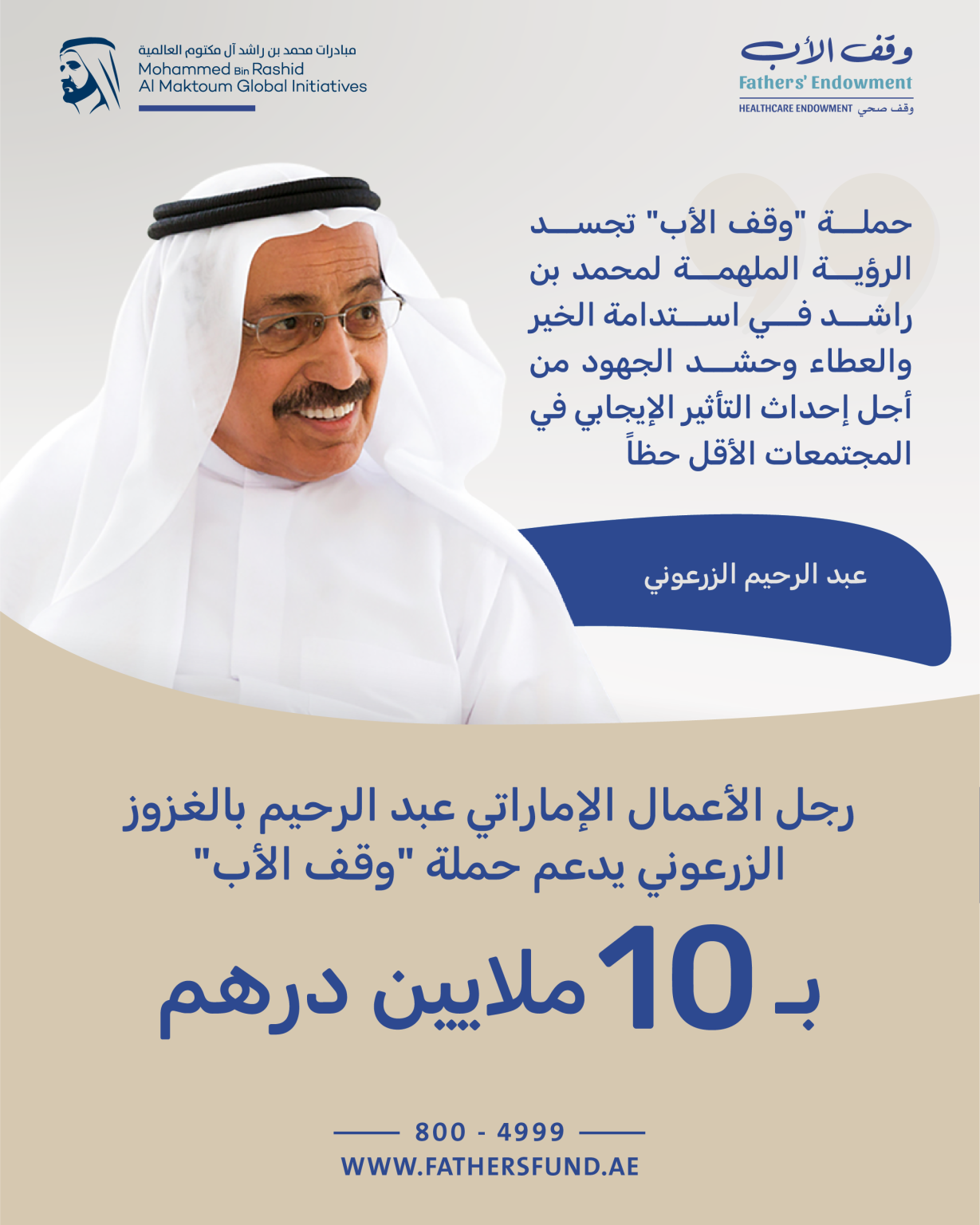 أعلن رجل الأعمال الإماراتي عبد الرحيم بالغزوز الزرعوني، عن مساهمته بمبلغ 10 ملايين دعماً لحملة “وقف الأب” التي أطلقها صاحب السمو الشيخ محمد بن راشد آل مكتوم، نائب رئيس الدولة رئيس مجلس الوزراء حاكم دبي “رعاه الله”، تزامناً مع شهر رمضان المبارك، بهدف تكريم الآباء في دولة الإمارات من خلال إنشاء صندوق وقفي مستدام، يخصص ريعه لتوفير العلاج والرعاية الصحية للفقراء والمحتاجين وغير القادرين.