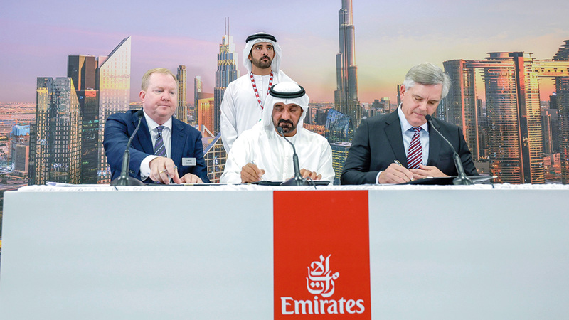 وبحضور سمو الشيخ حمدان بن محمد بن راشد آل مكتوم، ولي عهد دبي رئيس المجلس التنفيذي لإمارة دبي، وسمو الشيخ مكتوم بن محمد بن راشد آل مكتوم، النائب الأول لحاكم دبي نائب رئيس مجلس الوزراء وزير المالية، وسمو الشيخ منصور بن محمد بن راشد آل مكتوم، رئيس مجلس دبي الرياضي، وقّع طلبيات الطائرات سمو الشيخ أحمد بن سعيد آل مكتوم، الرئيس الأعلى الرئيس التنفيذي لـ«طيران الإمارات» والمجموعة، مع الرئيس والمدير التنفيذي لشركة «بوينغ» للطائرات التجارية، ستان ديل، والرئيس التنفيذي لـ«جنرال إلكتريك» والرئيس التنفيذي لـ«جي ئي إيروسبيس»، لاري كولب.