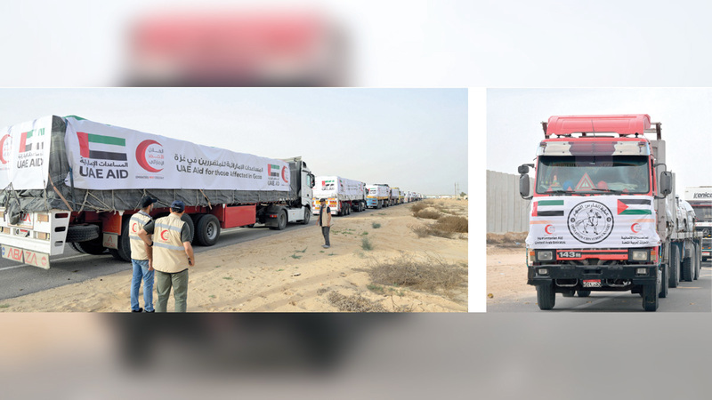 تحركت أمس، قافلة مساعدات إنسانية إماراتية من مدينة العريش المصرية إلى معبر رفح، تمهيداً لدخولها إلى قطاع غزة لتوزيعها تحت إشراف إماراتي ضمن عملية «الفارس الشهم 3»، التي أمر بها صاحب السمو الشيخ محمد بن زايد آل نهيان، رئيس الدولة، حفظه الله، لدعم الشعب الفلسطيني الشقيق في قطاع غزة. ضمت القافلة 13 شاحنة بإجمالي حجم مساعدات 272.5 طناً، وتتكوّن من 16 ألفاً و800 طرد غذائي بوزن 252 طناً محملة على 10 شاحنات، يستفيد منها 84 ألف شخص إلى جانب 360 خيمة بوزن 20.5 طناً محملة على ثلاث شاحنات. وتواصل الإمارات جهودها الإنسانية لدعم الأشقاء الفلسطينيين في إطار عملية «الفارس الشهم 3» من خلال تسيير جسر جوي وصل عدده 49 طائرة من أجل تخفيف معاناة المدنيين في قطاع غزة، التي تواجه ظروفاً استثنائية حرجة.