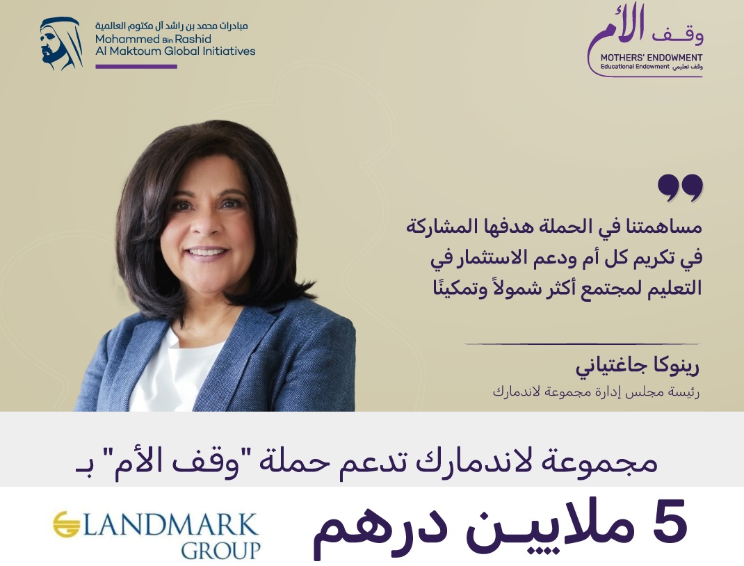 أعلنت مجموعة لاندمارك عن مساهمتها بـ 5 ملايين درهم لدعم حملة “وقف الأم” التي أطلقها صاحب السمو الشيخ محمد بن راشد آل مكتوم، نائب رئيس الدولة رئيس مجلس الوزراء حاكم دبي “رعاه الله”، لتكريم الأمهات بإنشاء صندوق وقفي بقيمة مليار درهم لدعم تعليم ملايين الأفراد حول العالم.