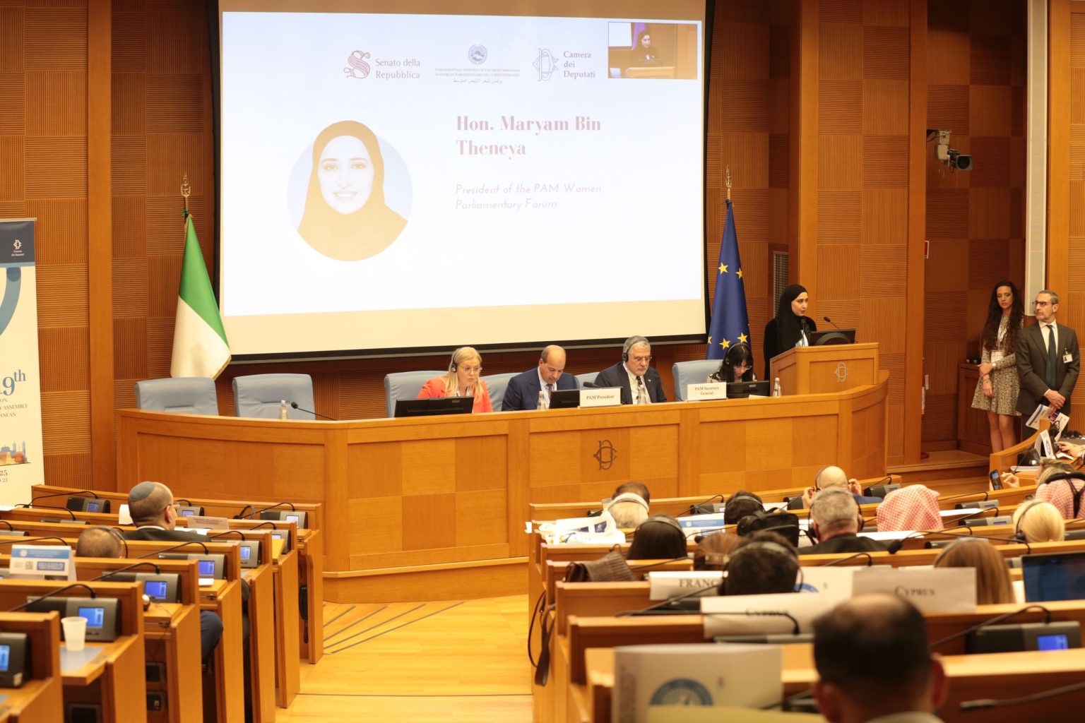 تسلمت النائب الثاني لرئيس المجلس الوطني الاتحادي، رئيسة مجموعة الشعبة البرلمانية الإماراتية في برلمان البحر الأبيض المتوسط، مريم ماجد بن ثنية، رئاسة منتدى النساء البرلمانيات التابع لبرلمان البحر الأبيض، وذلك في ختام أعمال الجلسة العامة التاسعة عشرة للبرلمان التي عقدت في مدينة روما بجمهورية إيطاليا، وأعلنت عن استضافة دولة الإمارات في العاصمة أبوظبي في شهر يونيو القادم، أعمال الدورة الثانية لمنتدى النساء.
