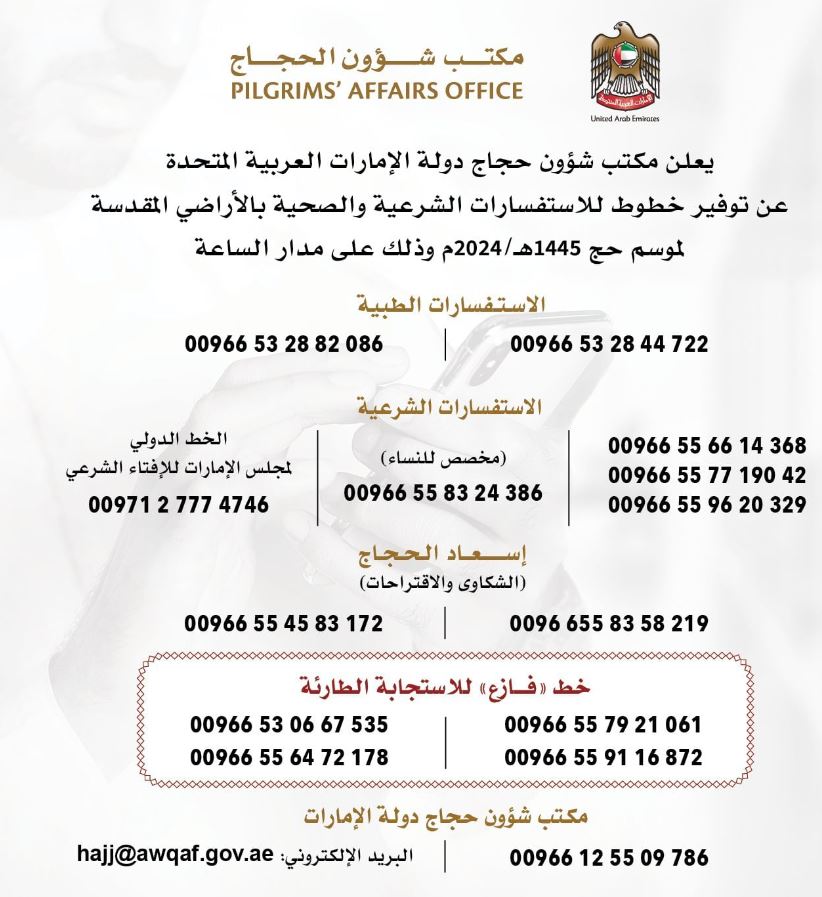 أطلق مكتب شؤون حجاج دولة الإمارات، منصة “فازع” للاستجابة للبلاغات الطارئة من قبل حجاج دولة الإمارات العربية المتحدة على مدار الساعة.