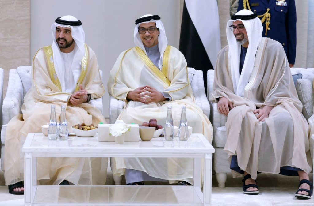 منصور بن زايد وخالد بن محمد بن زايد يستقبلان حمدان بن محمد بن راشد وأولياء العهود ونواب الحكام والشيوخ والمهنئين بعيد الأضحى