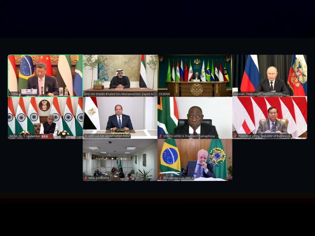 شارك في القمة الافتراضية لقادة دول مجموعة “بريكس”، شي جين بينغ، رئيس جمهورية الصين الشعبية، وفلاديمير بوتين، رئيس روسيا الاتحادية، وعبد الفتاح السيسي، رئيس جمهورية مصر العربية، وسيريل راما فوزا، رئيس جمهورية جنوب أفريقيا، والدكتور مسعود بزشكيان، رئيس الجمهورية الإسلامية الإيرانية، وبرابوو سوبيانتو، رئيس جمهورية إندونيسيا، ومعالي الدكتور سوبرامنيام جايشانكار، وزير الشؤون الخارجية في جمهورية الهند، والدكتور جيديون تيموثيوس، وزير خارجية جمهورية إثيوبيا الفيدرالية الديمقراطية.