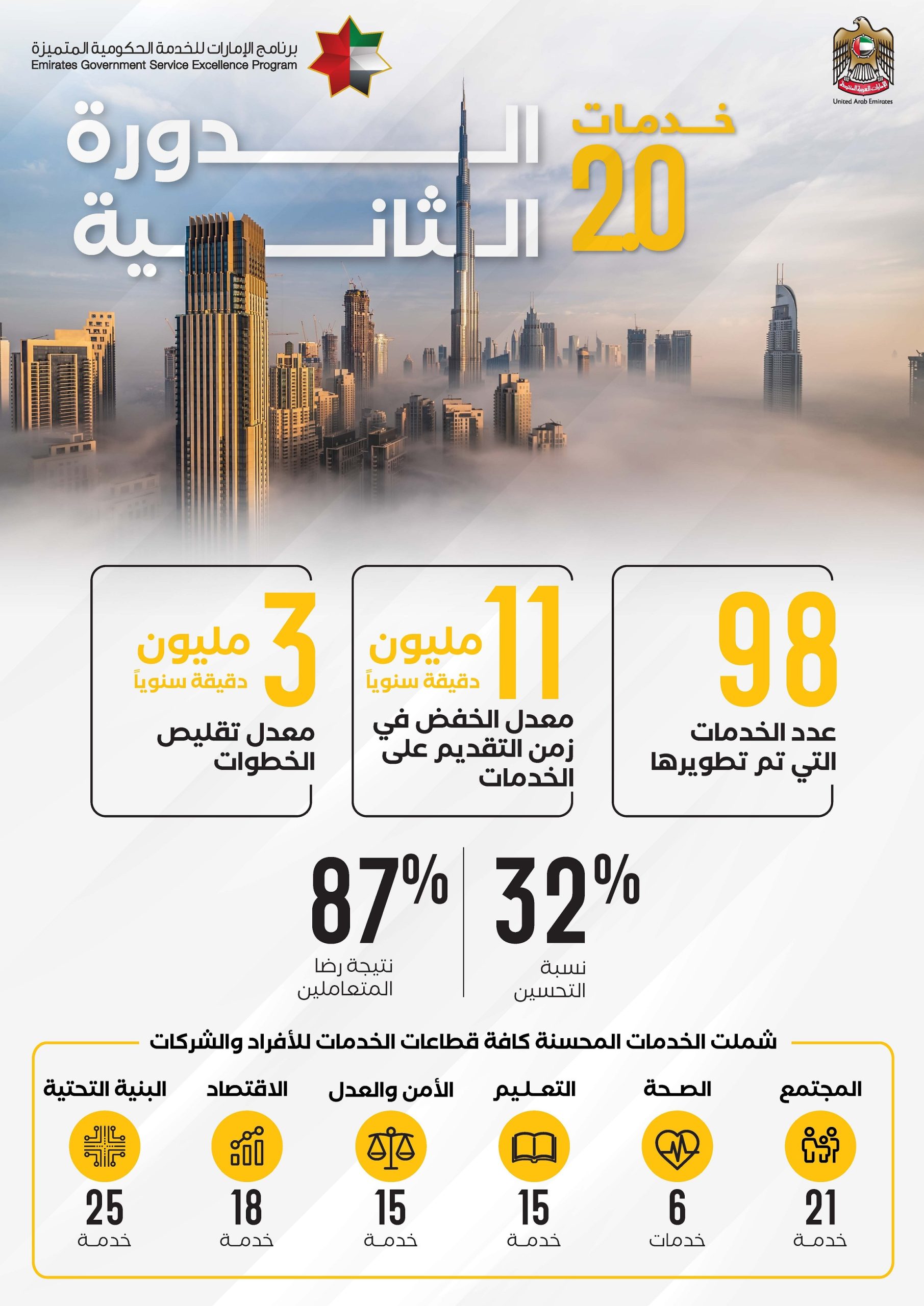 وحققت الجهات الحكومية في الدورة الثانية لنهج الخدمات الحكومية “خدمات 2.0” تحسناً إيجابياً بمعدل 32 في المائة للخدمات الحكومية التي تم العمل على تطويرها خلال 90 يوماً، وخفض عدد خطوات تجربة المتعامل بمعدل 25 في المائة، وتقليل 11 مليون دقيقة لتقديم الخدمات الحكومية.. وقد تضمنت عمليات التطوير كافة قطاعات الخدمات المقدمة للأفراد والشركات لتشمل قطاعات البنية التحتية، والمجتمع، والصحة، والتعليم، والاقتصاد، والأمن والعدل.